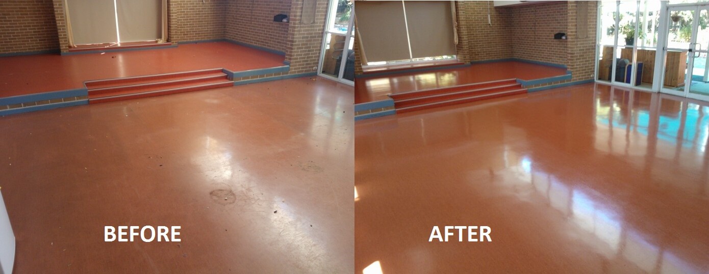 Vinyl floors are the top choice when it comes to busy areas such as lobbies, hallways and receptions. To keep your vinyl floor looking beautiful, the sealer (clear, plastic top layer of the floor) must be changed at least once a year. Over time the vinyl floor starts losing its shine due to ware and tear, build-up of oils, soap, and dust. Eventually the old layer of sealer starts getting dull and gets an appearance of a yellow discoloration.